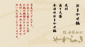 皆様でお酒を酌み交わしながら、やわらぎの鍋コースをご堪能ください。☆会社のご接待☆歓送迎会や忘年会、新年会☆各種サークルの打ち上げ など